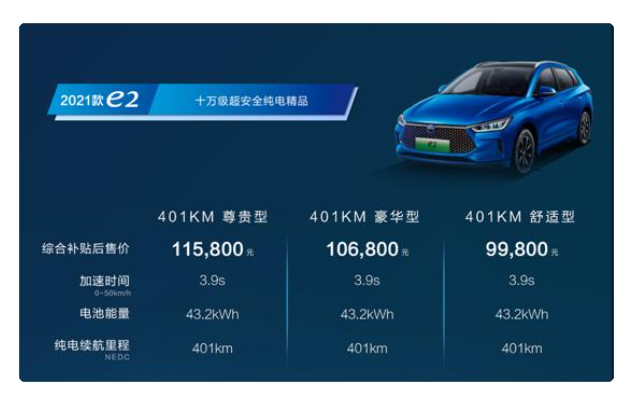2021款e2是一款具有動(dòng)感時(shí)尚設(shè)計(jì)、領(lǐng)先同級(jí)刀片電池技術(shù)、人性化智能交互多維升級(jí)的十萬(wàn)級(jí)超安全純電精品之作。它搭載刀片電池,加上輕量化安全車身,全面的主被動(dòng)安全配置。同時(shí)擁有401km超長(zhǎng)巡航,百公里電耗低至10.8kWh,性能全面領(lǐng)先同級(jí)。2021款e2綜合補(bǔ)貼后價(jià)格為9.98萬(wàn)元-11.58萬(wàn)元。