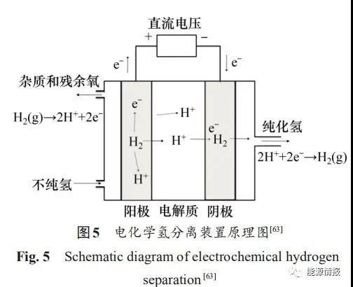 電化學(xué)氫分離(electrochemical hydrogenseparation)是指利用燃料電池的系統(tǒng),將混合氣體通入燃料電池,在電能驅(qū)動(dòng)下,使氫氣于陽極反應(yīng)生成氫離子,氫離子于陰極側(cè)與電子結(jié)合生成氫氣,排出高純氫氣?;诘蜏刭|(zhì)子交換膜燃料電池系統(tǒng)的電化學(xué)氫分離裝置最早開發(fā)于20世紀(jì)60年代,目前研究較多的是基于質(zhì)子交換膜燃料電池系統(tǒng),以聚苯并咪唑(PBI)薄膜作為電解質(zhì)的電化學(xué)分離裝置。電化學(xué)氫分離利用燃料電池的逆反應(yīng),以外加電場(chǎng)作為驅(qū)動(dòng)力,令電解質(zhì)中的離子定向移動(dòng)。其原理(見圖5)如下: