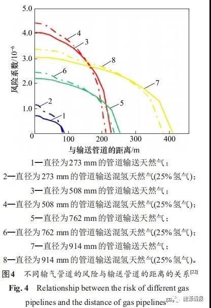 氫氣雖然具有較寬濃度的爆炸極限,但氫氣是最小的氣體分子,其擴(kuò)散速度較快。為評(píng)估管道失效情況下混氫天然氣技術(shù)的安全問題,NaturalHy項(xiàng)目建立了量化的風(fēng)險(xiǎn)評(píng)估模型,推算出輸氣管道附近不同位置的風(fēng)險(xiǎn)系數(shù)。在不同直徑的管道中,天然氣與注入了25%(體積分?jǐn)?shù),下同)氫氣的天然氣在輸送管道不同位置的風(fēng)險(xiǎn)系數(shù)如圖4所示。從圖4可見:對(duì)于含25%氫氣的天然氣管道運(yùn)輸,距離混氫天然氣管道較近位置的風(fēng)險(xiǎn)系數(shù)比純天然氣管道附近的略高,而距離混氫天然氣管道較遠(yuǎn)時(shí)的風(fēng)險(xiǎn)系數(shù)比純天然氣管道附近的低。