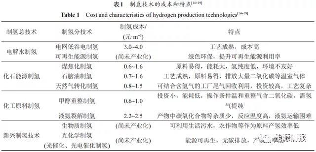 表1所示為幾種氫氣生產(chǎn)技術(shù)的成本和特點(diǎn),其中電解水制氫和化石能源制氫是目前較成熟的工業(yè)制氫技術(shù)。