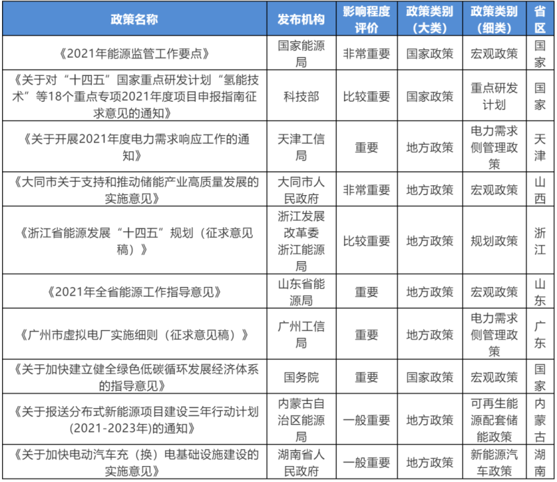 當(dāng)前,政策和市場(chǎng)環(huán)境是促進(jìn)我國(guó)儲(chǔ)能產(chǎn)業(yè)發(fā)展的關(guān)鍵。在進(jìn)入“十四五”發(fā)展的新階段,儲(chǔ)能在未來(lái)我國(guó)能源體系建設(shè)中的關(guān)鍵地位越發(fā)突顯,面對(duì)儲(chǔ)能商業(yè)化和規(guī)?;l(fā)展的需求,儲(chǔ)能聯(lián)盟一直在努力協(xié)同聯(lián)盟會(huì)員企業(yè)積極引導(dǎo)儲(chǔ)能政策和市場(chǎng)環(huán)境的改善。自2020年3月起,中關(guān)村儲(chǔ)能產(chǎn)業(yè)技術(shù)聯(lián)盟每月定期向產(chǎn)業(yè)同仁分享儲(chǔ)能直接支持政策信息,望各方與儲(chǔ)能聯(lián)盟一同探討,推動(dòng)政策研究工作,期望支持各應(yīng)用領(lǐng)域儲(chǔ)能發(fā)展的配套政策盡快落地出臺(tái)。