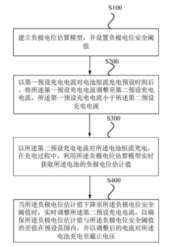 具體來看,該充電方法建立負極電位估算模型并設置負極電位安全閾值。在充電過程中,利用負極電位估算模型實時獲取電池的負極電位估計值;當負極電位估計值下降至負極電位安全閾值時,實時調(diào)整第二預設充電電流,以確保負極電位估計值與負極電位安全閾值的差值在預設范圍內(nèi),并以調(diào)整后的電流對電池充電,至充電截止電壓。
