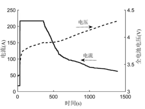(快充算法電流及端電壓隨時間變化的結(jié)果圖)