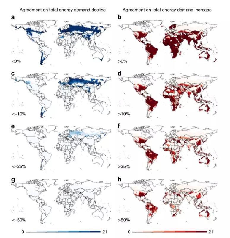 該研究使用計量經(jīng)濟(jì)的方法評估能源需求與人均收入、冷熱天數(shù)的響應(yīng),考慮2050年左右的平均氣溫的上升,推算出全球變暖使得全球能源需求在2050年左右增加了25-58%(在較溫和的溫升情況下也會增加11-27%),而能源需求由于社會經(jīng)濟(jì)、人口發(fā)展本身到2050年也將增長1.7-2.8倍。在美國,歐洲和中國的熱帶和南部地區(qū)的能源需求將因?yàn)闅夂蜃兣鲩L超過25%。