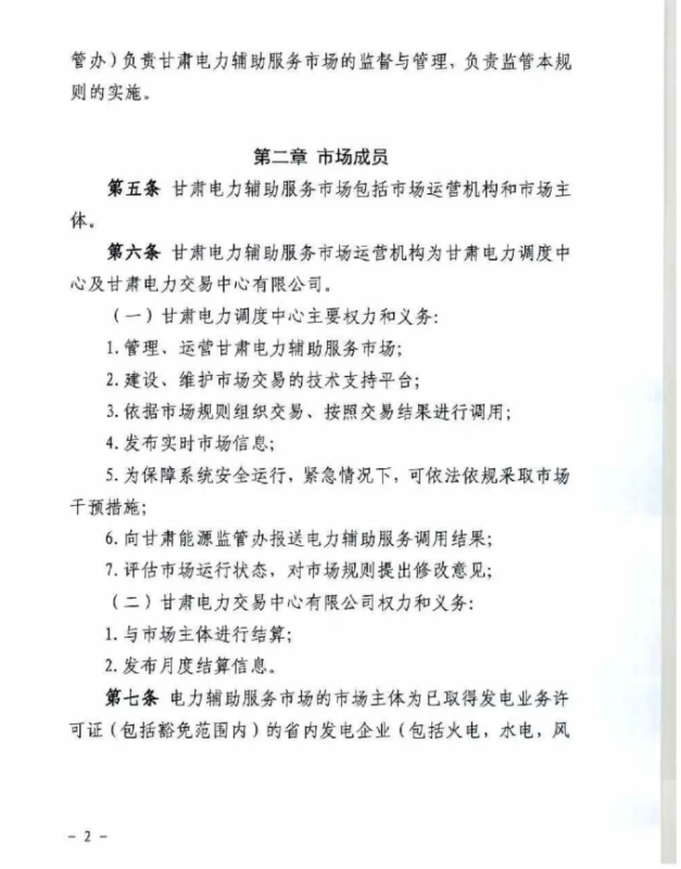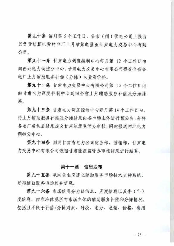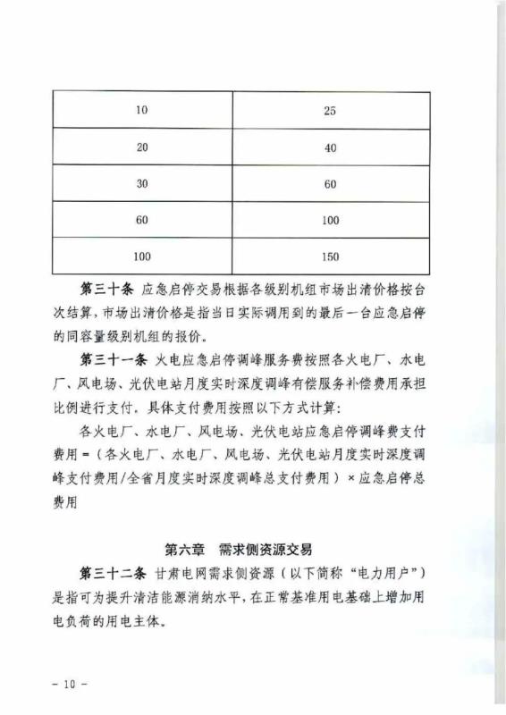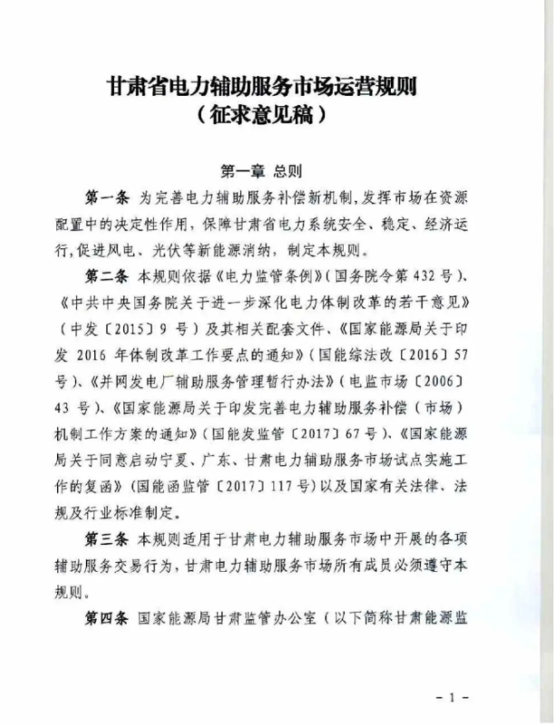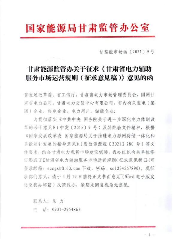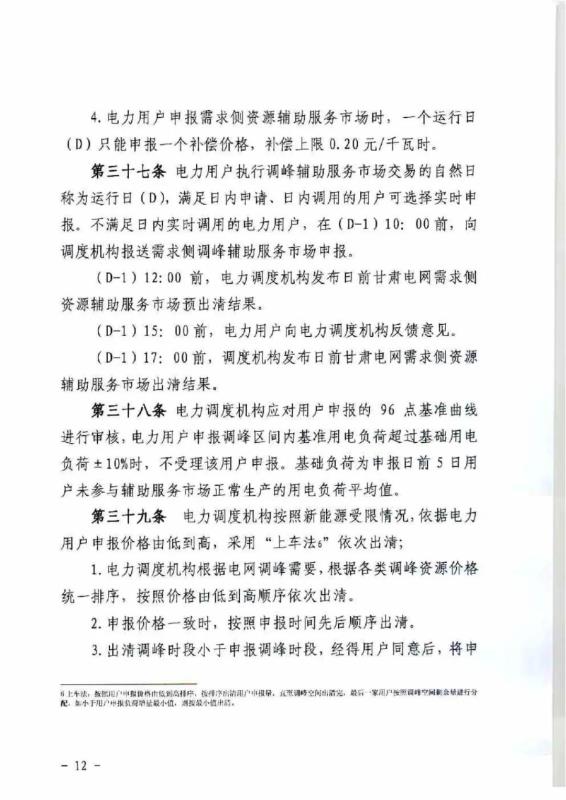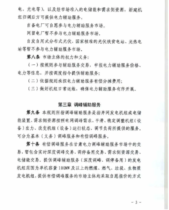 中國儲能網訊:4月10日,國家能源局甘肅監(jiān)管辦公室發(fā)布關于征求《甘肅省電力輔助服務市場運營規(guī)則(征求意見稿)》意見的函,意見稿規(guī)則較2019年發(fā)布的暫行補償價格有較大改變。調頻輔助服務補償價格由上限15元/MW下調至12元/MW。調峰輔助服務申報價格非現貨期間為0.5元/kWh,現貨期間為0.3元/kWh。