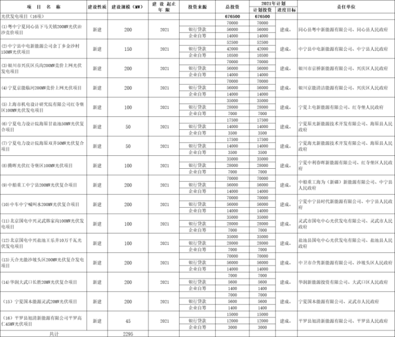 中國儲能網(wǎng)訊:4月7日,寧夏自治區(qū)發(fā)展改革委關(guān)于印發(fā)《2021年自治區(qū)重點項目投資計劃》的通知,據(jù)光伏們整理,其中光伏電站項目16個,涉及項目業(yè)主包括中國電建、隆基、京能、天合光能、華潤等多家企業(yè),總規(guī)模達2.295GW。項目分布在寧夏自治區(qū)的同心縣、中寧縣、興慶區(qū)、紅寺堡、海原縣、靈武市、鹽池縣、沙坡頭區(qū)、大武口區(qū)、平羅縣等地,項目總投資規(guī)模67.65億元。