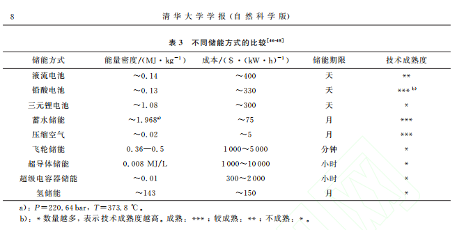 3)電磁儲能,包括超導(dǎo)體儲能和超級電容 器儲能.氫儲能的基本原理是電解水產(chǎn)生氫氣和氧氣,可以將其看作是化學(xué)儲能的延伸。表3歸納了不同儲能方式的能量密度、成 本、儲能期限和技術(shù)成熟度。對比可知,氫儲能相比于其他儲能方式有諸多優(yōu)點(diǎn).氫儲能的能量 密度顯著高于其他儲能方式,儲能期限較長,滿 足長時間儲能的需求,可實(shí)現(xiàn)可再生能源的跨季 儲能和跨區(qū)域能量傳遞.此外,電解水制氫可以提高可再生能源利用率,減少化石燃料的使用, 提高能源體系清潔化。氫儲能成本低于電化學(xué)儲能、電磁儲能和飛輪儲能,盡管略高于發(fā)展時間較久的壓縮空氣儲能和蓄水儲能,但隨著氫氣制備和儲運(yùn)技術(shù)的進(jìn)一步發(fā)展,市場規(guī)模的進(jìn)一步擴(kuò)大,成本將會進(jìn)一步降低.氫儲能是前景廣闊的可再生能源儲能方式,可在能源互聯(lián)網(wǎng)的構(gòu)建方面發(fā)揮重要作用。