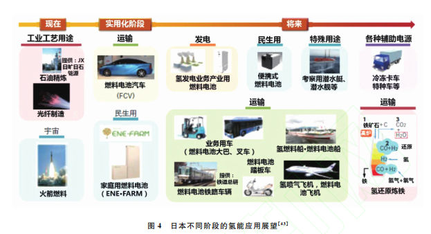 如圖4所示,日本對不同階段氫能在不同領(lǐng) 域的應(yīng)用進(jìn)行了分析,顯示了氫能在當(dāng)下能源系 統(tǒng)中的重要位置以及未來能源互聯(lián)網(wǎng)系統(tǒng)中的具體應(yīng)用前景.目前,日本比較成熟的氫能應(yīng)用包括石油精煉、光纖制造等工業(yè)制造領(lǐng)域和被當(dāng)作高能燃料使用的航空航天領(lǐng)域;目前處于實(shí)用化階段的應(yīng)用主要包括燃料電池汽車和家用燃料電池電站;隨著氫能相關(guān)技術(shù)的不斷進(jìn)步, 未來還會進(jìn)一步被用于業(yè)務(wù)產(chǎn)業(yè)用燃料電池發(fā)電、家用或特殊用途的燃料電池、不同類型的燃料電池交通工具(包括業(yè)務(wù)用車、公共汽車、列車、船、飛機(jī))等 各種備用電源,以及更多的工業(yè)應(yīng)用等。