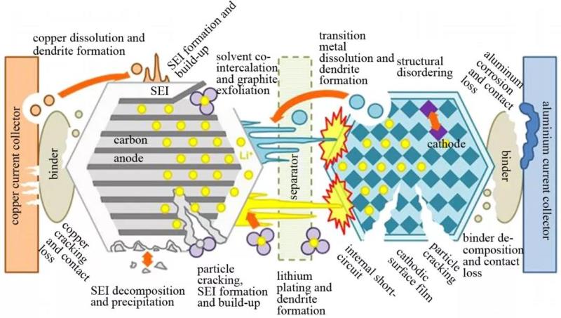 圖3揭示了鋰離子電池老化過程所有可能經(jīng)歷的內部變化。電池的首次充電過程使負極(一般為嵌鋰碳)和電解質發(fā)生電化學反應,生成SEI膜;在電池的后續(xù)循環(huán)過程中,電化學寄生副反應使SEI沉積并變厚,電極材料的不斷膨脹與收縮導致新的活性位點暴露出來,在快速充放電或電極活性物質分布不均勻的情況下,活性物質(模型中一般簡化為顆粒)容易發(fā)生粉化、碎裂、脫落或結構錯位;與此同時,如果電池長期在高于其額定電流的電流密度下快速充電或低溫下充電,其負極表面容易形成金屬鋰枝晶。金屬鋰用作電池負極時,也容易產生枝晶,若這兩種枝狀晶體逐漸生長,容易刺穿隔膜,引起電池內部的短路。此外,當電池過放電時(1~2 V),負極的集流體銅箔開始溶解,在電極上析出形成銅枝晶,易造成電池短路,同樣,正極集流體鋁的表面氧化膜長時間與電解質相互作用可能發(fā)生溶解,使得鋁箔被電解質腐蝕。