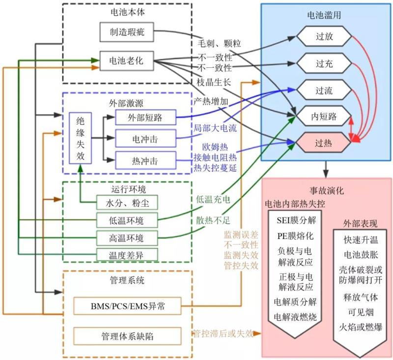 儲能安全問題是系統(tǒng)性問題,事故的發(fā)生往往由多因素交互作用演化發(fā)展,最終導致電池濫用及熱失控的發(fā)生。借鑒韓國儲能事故報告對安全誘因的分類,本文將安全事故成因劃分為電池本體、外部激源、運行環(huán)境及管理系統(tǒng)四類,并討論四類誘發(fā)因素的相互作用機制及對電池濫用和失控過程的觸發(fā)機制。圖2歸納了四類誘發(fā)因素交互及濫用觸發(fā)關系。