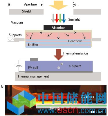 固態(tài)光熱伏電池示意圖 圖片來源:"A Nanophotonic Solar Thermophotovoltaic Device”. Nature Nanotechnology, Vol.9, 126 (2014)