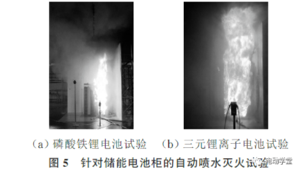 2019年NFPA發(fā)布《鋰離子儲能系統(tǒng)自動噴水保護》指南,針對三元鋰離子電池儲能柜和磷酸鐵鋰電池儲能柜開展了自動噴水滅火試驗。結(jié)果表明,對于并排布置的儲能柜,自動噴水滅火系統(tǒng)僅能起到延緩火焰蔓延的效果,但無法完全撲滅火災(zāi),尤其是對三元鋰離子電池儲能柜,持續(xù)噴水未能有效阻止儲能柜全面燃燒,如圖5所示。