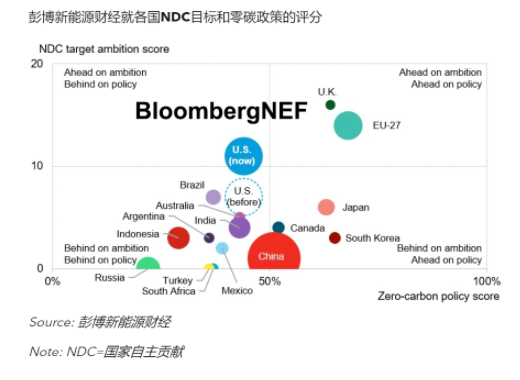 彭博新能源財經(jīng)評估顯示,美國在國家自主貢獻(NDC)目標(biāo)雄心方面全球排名