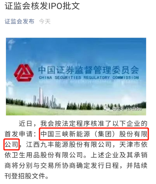 中國(guó)儲(chǔ)能網(wǎng)訊:4月23日,經(jīng)中國(guó)證監(jiān)會(huì)核準(zhǔn),中國(guó)長(zhǎng)江三峽集團(tuán)有限公司(以下簡(jiǎn)稱“三峽集團(tuán)”)旗下中國(guó)三峽新能源(集團(tuán))股份有限公司(以下簡(jiǎn)稱“三峽新能源”)獲得首次公開發(fā)行股票(IPO)批文,向登陸資本市場(chǎng)邁出關(guān)鍵一步。至此,三峽新能源上市正式進(jìn)入鳴鑼倒計(jì)時(shí),迎來高質(zhì)量發(fā)展新機(jī)遇。接下來,三峽新能源及其主承銷商將與上海證券交易所協(xié)商確定發(fā)行日程,并刊登招股文件。