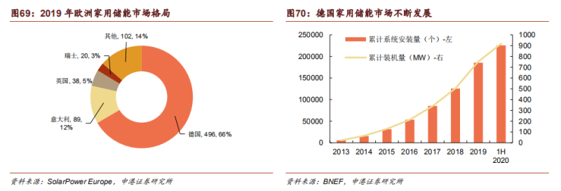 隨著歐洲各國加速能源結(jié)構(gòu)調(diào)整,家用儲能市場快速發(fā)展。目前,歐洲已成為全球最大的家用儲能市場。根據(jù) SolarPower Europe 數(shù)據(jù)顯示,2019 年歐洲家用儲能新增裝機量達到 745MWh,同比增長 57%;累計裝機量達到 1997MWh,同比增長60%。