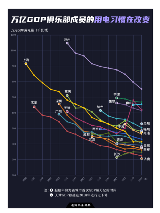 不過(guò),總體來(lái)看,得益于第三產(chǎn)業(yè)高速發(fā)展以及各地制造業(yè)結(jié)構(gòu)的持續(xù)優(yōu)化,高耗能產(chǎn)業(yè)占比降低、高端制造業(yè)占比逐步提升等,大多數(shù)萬(wàn)億GDP城市單位GDP用電量都呈下降趨勢(shì)。