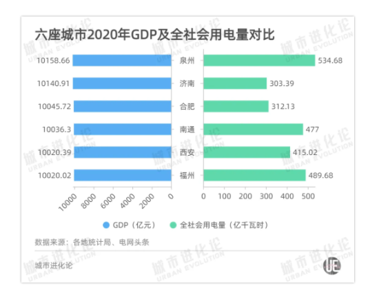 比如,剛剛邁入萬(wàn)億俱樂(lè)部的泉州、南通、福州、西安、合肥、濟(jì)南六座城市,GDP最高的泉州是最低的福州1.01倍,但用電量最高的泉州卻是最低的濟(jì)南1.76倍。