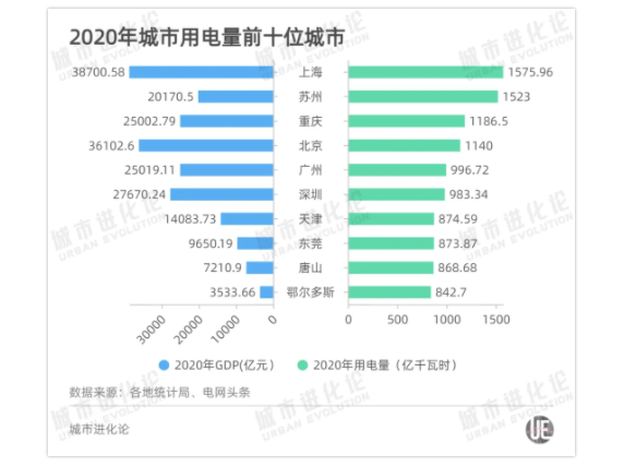 在2020年全國(guó)城市用電量榜單中,上海、蘇州、重慶、北京分別以1575.96、1523、1186.5、1140億千瓦時(shí)用電量居GDP百?gòu)?qiáng)城市前四位。