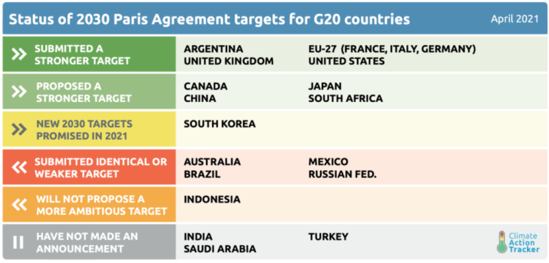 在峰會上,日本和加拿大首相宣布了新的氣候目標(biāo),而中國表示在2025年達(dá)到煤炭峰值,并在2025年之后開始削減煤炭產(chǎn)量。拜登總統(tǒng)則宣布了雄心勃勃的2030年新目標(biāo),比2005年的水平低50%至52%,雖然這是一個(gè)重大的進(jìn)步,但仍沒有達(dá)到與《巴黎協(xié)定》的1.5%相一致所需的比2005年低57%至63%的水平,并承諾增加美國對發(fā)展中國家的支持。