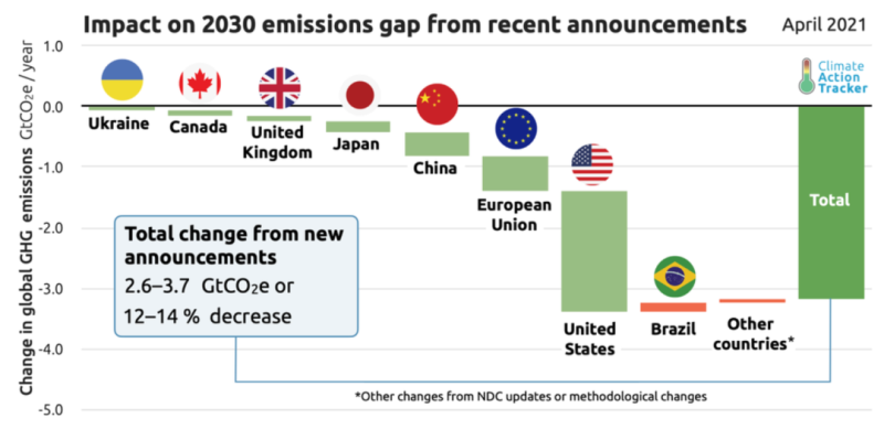 氣候行動追蹤機(jī)構(gòu)(climate action Tracker)在美國召集的氣候峰會后的分析顯示,氣候峰會上各國宣布的氣候行動,連同去年9月以來宣布的氣候承諾,到2030年將可新增減排量可達(dá)26-37億噸二氧化碳,相對減排幅度約為12-14%。