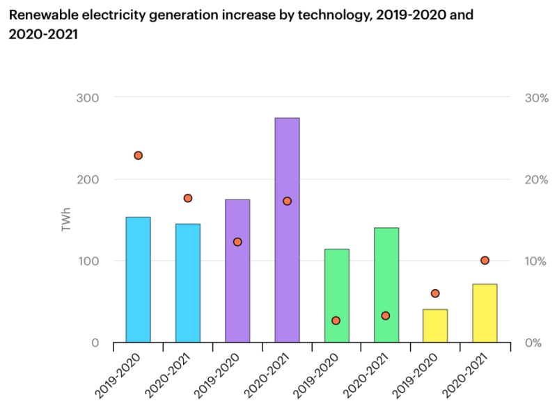 國(guó)際能源署預(yù)測(cè)2021年全球可再生能源發(fā)電量將增長(zhǎng)8%以上,達(dá)到8300太瓦時(shí),這是自1970年代以來(lái)的最快同比增長(zhǎng)。太陽(yáng)能光伏和風(fēng)能將占可再生能源發(fā)電量增長(zhǎng)的三分之二。2021年全球可再生能源電力增長(zhǎng)量中,僅中國(guó)就將占到近一半,其次是美國(guó)、歐盟和印度。