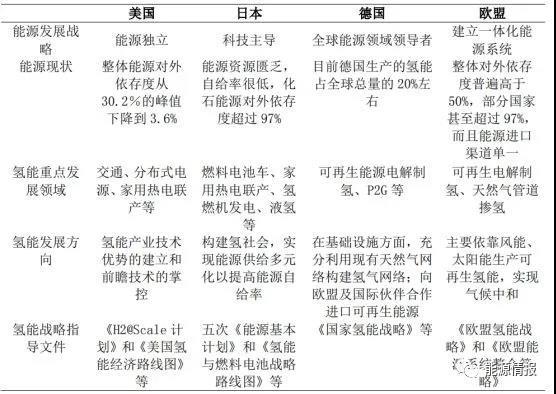 表 3 歐美日等國和地區(qū)氫能發(fā)展特點比較
