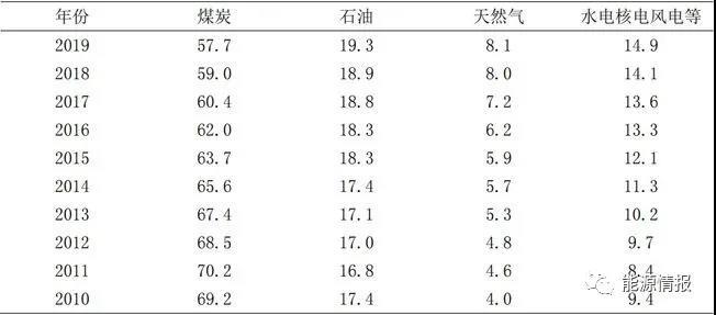 表 1 2010—2019 年中國能源消費結(jié)構(gòu)占比 %