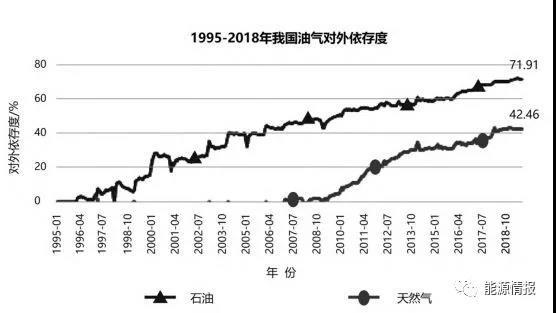 推動我國能源高質(zhì)量發(fā)展是確保能源安全的前提和基礎(chǔ)。在世界油氣產(chǎn)業(yè)發(fā)展風(fēng)險和不確定因素增多的背景下,我國能源供應(yīng)安全問題日益突出。近年來,中國的石油和天然氣對外依存度一直在上升。到2019年,中國原油對外依存度和石油對外依存度均超過70%,其中原油為72.4%,石油為70.8%,同時,天然氣對外依存度達(dá)到43%。詳見圖1。