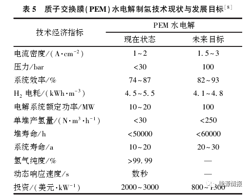 綠色、低成本制氫技術(shù)是氫能產(chǎn)業(yè)發(fā)展的關(guān)鍵。質(zhì)子交換膜(PEM)水電解制氫技術(shù)在總體效率、工作電流密度、氫氣純度、產(chǎn)氣壓力以及動(dòng)態(tài)響應(yīng)速度等方面優(yōu)于堿性水電解制氫技術(shù)(詳見(jiàn)表5),能適應(yīng)可再生能源發(fā)電的波動(dòng)性,是氫能產(chǎn)業(yè)鏈發(fā)展的重點(diǎn)技術(shù)之一,但目前面臨采用鉑催化劑、電耗高而導(dǎo)致的制氫成本較高問(wèn)題。突破鉑催化劑、電堆等關(guān)鍵技術(shù),進(jìn)一步提高電流密度、系統(tǒng)能效、降低投資是PEM制氫技術(shù)的重點(diǎn)開(kāi)發(fā)方向。