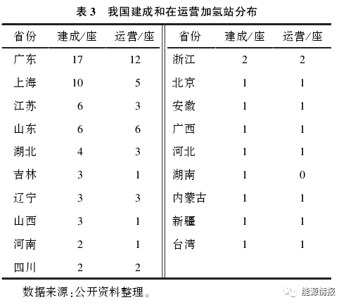 加氫站的網(wǎng)絡(luò)布局與氫燃料電池車(chē)的市場(chǎng)規(guī)模依然是產(chǎn)業(yè)初期互相掣肘的因素。純電動(dòng)車(chē)推廣和充電樁建設(shè)也曾經(jīng)面臨過(guò)同樣問(wèn)題,加注車(chē)輛較少,限制了加氫站的良性滾動(dòng)發(fā)展。目前國(guó)內(nèi)建設(shè)和在運(yùn)營(yíng)加氫站分別是66座和46座,分布在19個(gè)省市,其中廣東、上海、江蘇、山東是加氫站主要集中地區(qū)(見(jiàn)表3)。目前國(guó)內(nèi)加氫站數(shù)量與規(guī)劃2020年建設(shè)100座、2030年建成1000座還有較大差距。國(guó)內(nèi)最早示范運(yùn)營(yíng)的上海安亭、北京永豐加氫站始終處于加氫車(chē)輛少的尷尬局面。德國(guó)H2 Mobility項(xiàng)目已建成的加氫站也存在車(chē)少的狀況,但仍在推進(jìn)2023年建設(shè)400座加氫站網(wǎng)絡(luò)的目標(biāo),試圖解決產(chǎn)業(yè)初期的問(wèn)題。