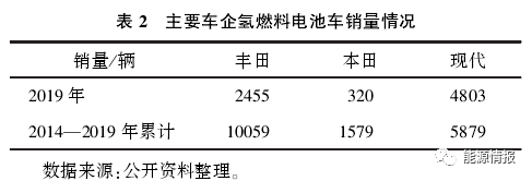 氫燃料電池車(chē)尚未規(guī)模化生產(chǎn),市場(chǎng)銷量有限。目前,全球最大的氫燃料電池車(chē)企業(yè)——豐田公司現(xiàn)有生產(chǎn)能力僅3000輛/年,2020年也只能達(dá)到3萬(wàn)輛/年,本田、現(xiàn)代、日產(chǎn)、上汽等車(chē)企雖相繼推出商業(yè)化車(chē)型,但市場(chǎng)銷量依然有限(見(jiàn)表2)。氫燃料電池發(fā)動(dòng)機(jī)企業(yè)億華通與宇通客車(chē)、福田汽車(chē)、中通客車(chē)等車(chē)企合作,建設(shè)了國(guó)內(nèi)首條自動(dòng)化氫燃料電池發(fā)動(dòng)機(jī)生產(chǎn)線,年產(chǎn)能也僅1萬(wàn)臺(tái)。生產(chǎn)規(guī)模小導(dǎo)致整車(chē)成本較高,如豐田公司官網(wǎng)上2020款Mirai售價(jià)為58 550美元,是混合動(dòng)力2020款PRIUS售價(jià)(24325美元)的2.5倍,遠(yuǎn)高于消費(fèi)者預(yù)期。