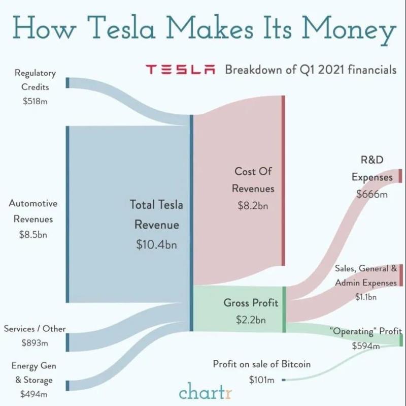 這些收入刨去82億美元的生產(chǎn)成本,毛利潤(rùn)為22億美元。毛利潤(rùn)中有6.66億美元用于研發(fā),11億美元用于銷售和行政開(kāi)支,營(yíng)運(yùn)凈利潤(rùn)為5.94億美元。此外,特斯拉還靠出售比特幣賺了1.01億美元。