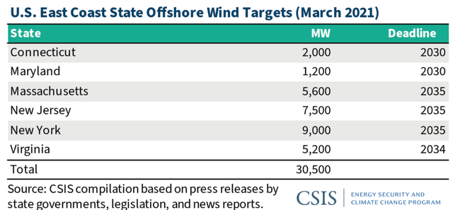 盡管美國還沒有什么大型海上風(fēng)電項(xiàng)目在開工建設(shè),但美國幾個(gè)東部州正爭(zhēng)先恐后地設(shè)定雄心勃勃的目標(biāo)。紐約以2035年安裝9GW海上風(fēng)電目標(biāo)領(lǐng)先【10】,新澤西州以7.5GW的目標(biāo)緊隨其后【11】,馬薩諸塞州的目標(biāo)是5.6GW,再加上馬里蘭州、弗吉尼亞州這些州,總的裝機(jī)目標(biāo)已略高于拜登宣布的2030年30GW的目標(biāo)。
