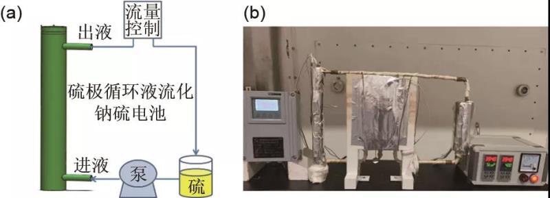 鈉硫電池最大的安全隱患來源于鈉和硫反應(yīng)時的劇烈放熱,因此如何有效地控制陶瓷管受損時直接接觸的鈉或/和硫的質(zhì)量將成為從根本上改善鈉硫電池安全性的一個重要方向。液流電池作為一種技術(shù)較為成熟的儲能電池體系,其特點是活性物質(zhì)具有流動性,可以實現(xiàn)電化學(xué)反應(yīng)場所(電極)與儲能活性物質(zhì)在空間上的分離,安全性高,電池功率與容量設(shè)計相對獨(dú)立,適合大規(guī)模蓄電儲能需求,但是傳統(tǒng)液流電池還存在能量密度較低、電流密度低、材料成本和制造成本高等問題。如果將鈉硫電池液流化,那么在保持鈉硫電池優(yōu)勢的同時,可以有效地提高鈉硫電池的安全性。最近,SICCAS進(jìn)行了管式液流化鈉硫電池結(jié)構(gòu)原型的設(shè)計和開發(fā)工作(專利申請?zhí)?02110113570.1),圖18(a)和18(b)分別顯示了這種管式液流化鈉硫電池的結(jié)構(gòu)示意圖和原型電池。與典型的液流電池不同,電池鈉負(fù)極限制在負(fù)極腔室,硫正極單獨(dú)從下至上通過泵送在正極腔室循環(huán)流動。鈉硫電池液流化的結(jié)構(gòu)設(shè)計主要有兩個方面的優(yōu)勢:一方面,鈉硫電池液流化可有效地提高鈉硫電池的安全性。組件內(nèi)部設(shè)置溫度傳感器,一旦電池超溫,溫度控制器輸出報警信號,隨即切斷外部循環(huán)管道閥門以保證系統(tǒng)的安全;另一方面,鈉硫電池液流化可進(jìn)一步提高鈉硫電池的能量輸出能力。正負(fù)極材料通過外部罐體存儲,電池容量經(jīng)過匹配正負(fù)極材料的質(zhì)量和罐體的容積得以大幅提高。當(dāng)然這一設(shè)計的實現(xiàn)還存在諸多技術(shù)難點,例如大面積陶瓷電解質(zhì)膜的可靠制備;電芯與接觸液體部件的熱管理;高溫循環(huán)泵的選型等。