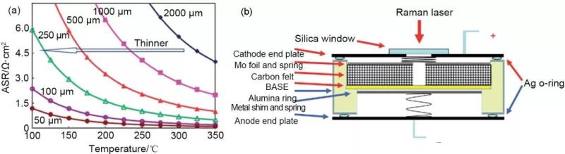圖16 (a) 不同厚度β"-Al2O3陶瓷電解質(zhì)的離子電導(dǎo)率隨溫度的變化趨勢;(b) 配置原位拉曼光譜觀察窗的平板中溫鈉硫電池
