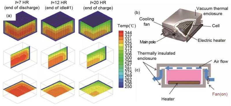 鈉硫電池保溫箱技術(shù)由于涉及電池能耗和安全性相關(guān)的熱管理,屬于鈉硫電池的核心技術(shù)之一。最近,Schaefer等結(jié)合第一性原理建立了鈉硫電池的全耦合熱電化學(xué)動力學(xué)模型。模型考慮了歐姆損耗、Peltier熱和熵變引起的熱,利用該模型對充放電過程中不同電流密度下的電池特性進(jìn)行了研究。SICCAS和RIST在鈉硫電池保溫箱技術(shù)的設(shè)計領(lǐng)域開展了系列工作。如圖14(a)所示,Min等模擬了充放電過程中保溫箱內(nèi)部溫度場的變化與分布。在電池放電過程中,由于焦耳熱和放熱反應(yīng)導(dǎo)致溫度升高約30 ℃,如果不加干預(yù),容易造成模組超溫。如圖14(b)和(c)所示,NGK報道的L33型模組采用真空絕熱罩加冷卻風(fēng)道的設(shè)計,可根據(jù)模組溫度自動啟動冷卻風(fēng)扇,電池上方的氣流充分地將熱量排出[29]。