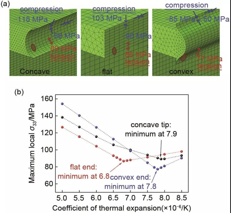 圖11 (a) 凸、平和凹三種尖端形狀的玻璃密封件在熱震過程中承受的局部應(yīng)力計算結(jié)果;(b) 最大局部應(yīng)力與玻璃熱膨脹系數(shù)之間的關(guān)系