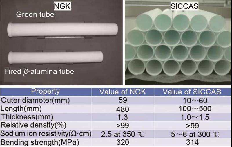 圖9 NGK和SICCAS的β"-Al2O3陶瓷管以及它們的性能參數(shù)