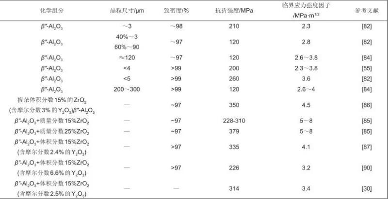 表2 不同微結(jié)構(gòu)和氧化鋯摻雜的β″-Al2O3陶瓷的抗折強(qiáng)度和臨界應(yīng)力強(qiáng)度因子