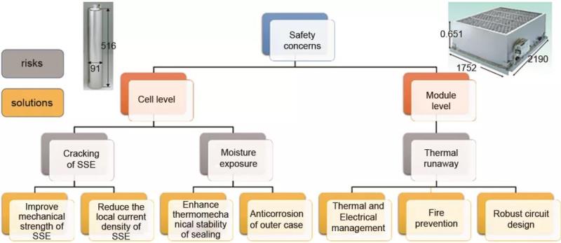 圖7針對以上兩個層面所面臨的安全挑戰(zhàn)提出了系統(tǒng)的解決策略。除了傳統(tǒng)的通過添加鈉芯安全管以限制活性鈉的流動以外,在電芯層面,首先需要保證固體電解質(zhì)具有足夠的力學(xué)性能,如抗折強(qiáng)度和斷裂韌性,以及固體電解質(zhì)的抗沖擊能力。其次,減小固體電解質(zhì)在充放電循環(huán)過程中可能出現(xiàn)的表面局部電流密度集中,以減緩固體電解質(zhì)的電化學(xué)退化速度。再次,需要提高密封部件和電芯外殼的耐熱沖擊性能(抗熱震性能)和耐腐蝕性能,以保證電芯部件在整個工作溫度范圍內(nèi)的長期穩(wěn)定。在模組層面,首先對模組進(jìn)行熱管理是必要的,其次需要對電池運(yùn)行深度進(jìn)行系統(tǒng)管理,避免電池過充過放。再次,一旦模組中個別電池出現(xiàn)火情,需要保證模組能快速反應(yīng)阻止火勢蔓延。另外,有效的安全電路設(shè)計也能在一定程度上提升電池的安全性能。