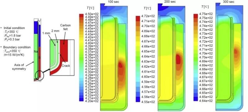 圖6 鈉硫電池運(yùn)行過程中固體電解質(zhì)裂縫導(dǎo)致溫升的數(shù)值模擬圖