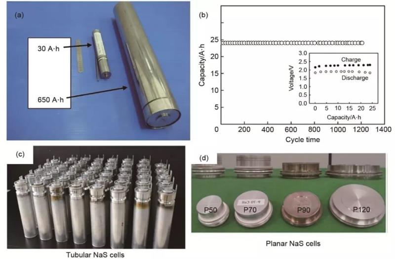圖5 (a,b) SICCAS開發(fā)的30 A·h和650 A·h鈉硫單體電池及其循環(huán)性能;(c,d) RIST開發(fā)的管式和平板式鈉硫單體電池