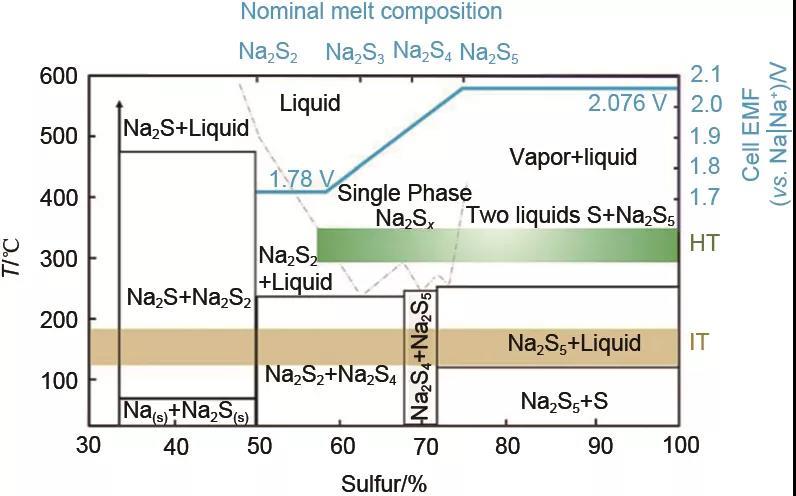 鈉硫電池的工作溫度控制在300~350 ℃,此時鈉與硫均呈液態(tài),β"-Al2O3具有高的離子電導(dǎo)率(約0.2 S/cm),電池具有快速的充放電反應(yīng)動力學(xué)。理解鈉硫電池的工作溫度是重要的。圖3顯示了Na2Sx的相圖,圖中上部藍(lán)色曲線為電池300 ℃下的理論放電曲線,虛線對應(yīng)了不同放電深度反應(yīng)產(chǎn)物的熔點。Na2S4作為正極主要放電產(chǎn)物,其熔點為290 ℃,因此工作溫度降低不僅影響固體電解質(zhì)β"-Al2O3的鈉離子導(dǎo)電性,還會造成放電深度降低。溫度高于400 ℃時,正極熔體氣化導(dǎo)致電池內(nèi)壓上升,影響電池安全運(yùn)行。