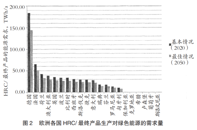 在歐盟內(nèi)部,德國對HRC/最終產(chǎn)品生產(chǎn)的綠色能源需求量最高,為184TWh/a(最佳情況為144TWh/a)。法國為57TWh/a(最佳情況為43TWh/a),荷蘭和奧地利的需求量大約為35TWh/a(最佳情況為25TWh/a)。