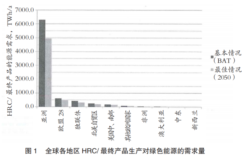 將全球煉鋼生產(chǎn)從碳基轉(zhuǎn)型為氫基工藝,在基本情況下,生產(chǎn)HRC的綠色能源需求量為7920TWh/a,在最佳情況下,為6210TWh/a。相應(yīng)所需的氫氣量將在13000億到11200億m3(STP)之間。圖1和圖2給出了HRC/最終產(chǎn)品按區(qū)域劃分的綠色能源需求。對于HRC生產(chǎn),亞洲目前擁有最大的綠色能源需求量(基本情況為6300TWh/a;最佳情況為4940TWh/a),其次是歐盟(基本情況為610TWh/a;最佳情況為480TWh/a)和獨聯(lián)體國家(基本情況為420TWh/a;最佳情況為310TWh/a)。