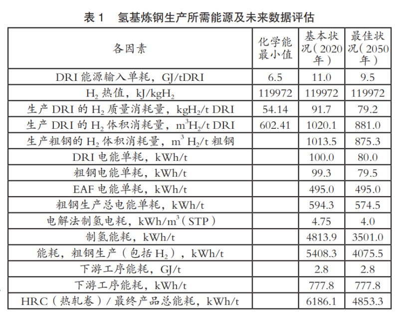 這是整個煉鋼生產(chǎn)中能耗最大的工序。對于目前的現(xiàn)代化直接還原廠,假定DRI生產(chǎn)工藝的能耗為11GJ/t。根據(jù)這個值,計算每噸DRI的氣體消耗(SGR)為1020.12m3H2(STP)/t。根據(jù)鐵礦石的質(zhì)量不同,每噸粗鋼需要投入DRI大約為1150kg,也使SGR的消耗量提高至1177m3H2(STP)/t粗鋼。如果加入廢鋼(如在BF-BOF工藝中),SGR的噸鋼消耗量也會隨廢鋼的加入量而變化。在這種情況下,為了比較傳統(tǒng)的BF-BOF工藝和直接還原煉鋼工藝,假設(shè)廢鋼加入量是相同的。當(dāng)廢鋼加入量為155kg時,粗鋼的SRG為1013.46m3H2(STP)(見表1)。計算EAF中熔煉工藝需要的氫氣生產(chǎn)所需能源和電能,現(xiàn)今的能源單耗為5408kWh/t。在最佳的情況下(根據(jù)未來直接還原煉鋼工藝和電解工藝技術(shù)的發(fā)展而調(diào)整輸入?yún)?shù)),未來粗鋼生產(chǎn)的能源單耗可降低至4075 kWh/t。