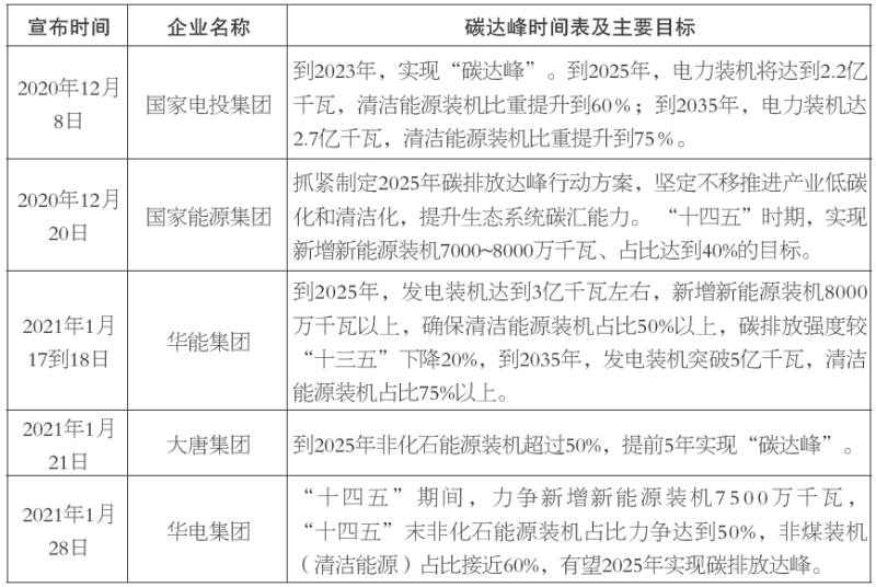 表1 五大發(fā)電企業(yè)碳達(dá)峰時(shí)間表及主要目標(biāo)圖片