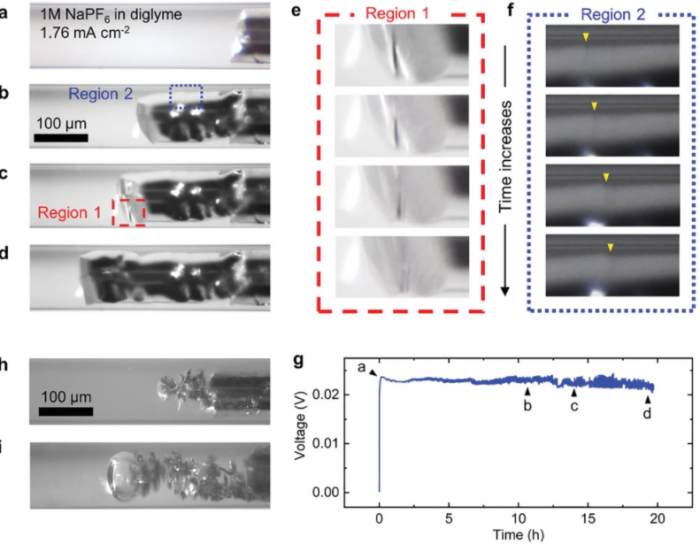 科學(xué)家們能夠通過一個特制的透明設(shè)備實時觀察電池性能,這使他們能夠發(fā)現(xiàn)不穩(wěn)定性和被稱為樹枝狀的致命結(jié)構(gòu)的形成,這些結(jié)構(gòu)導(dǎo)致電池短路和失效。這使該團隊能夠做出調(diào)整,例如減少電解液中的水含量,以限制與堿金屬鈉的反應(yīng),這通常會導(dǎo)致樹枝狀結(jié)構(gòu)的產(chǎn)生。