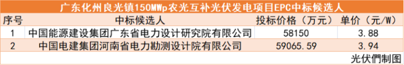 5月7日,廣東化州良光鎮(zhèn)150MWp農(nóng)光互補光伏發(fā)電項目EPC總承包工程公示中標候選人,其中中國能源建設(shè)集團廣東省電力設(shè)計研究院有限公司以投標價格58150萬元,單價3.88元/瓦,成為第一中標候選人。具體中標詳情如下: