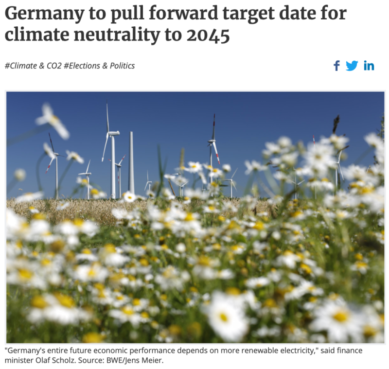 據(jù)cleanenergywire.org網(wǎng)站報道,德國社會民主黨(SPD)和總理默克爾保守黨(CDU/CSU)的政府聯(lián)盟已經(jīng)達成協(xié)議,向國會提交氣候行動法修改草案。根據(jù)這個草案,德國將在2045年實現(xiàn)氣候中和,將此前的目標提前了5年。德國政府還提出到2030年將排放量減少65%的新目標(而目前的目標是55%),并提出到2040年前減排88%。